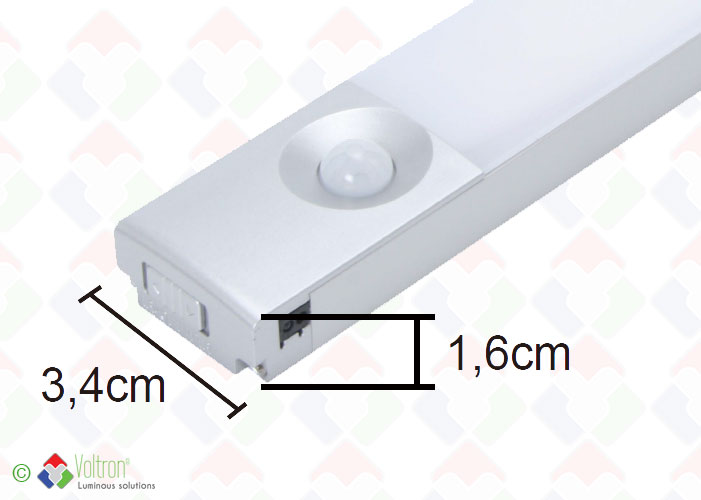 Rechargeable LED lamp with aluminum housing. PCB with 3 rows of LED chips (6led per cm) in blue light (490nm). Equipped with a built-in magnet and with accompanying iron plate with 3M tape. Included a charging cable USB to micro USB. Built-in IR sensor for mounting in cabinets, drawers and other moving parts. IR sensor detection: between 0,5cm and 10cm. Built-in PIR sensor for use of presence detection. PIR sensor detection: between 1cm and 2 meters at 120 °. Dimensions are 25x3.4x1.6cm. 0.7W consumption and 4 hours working time at 100%.